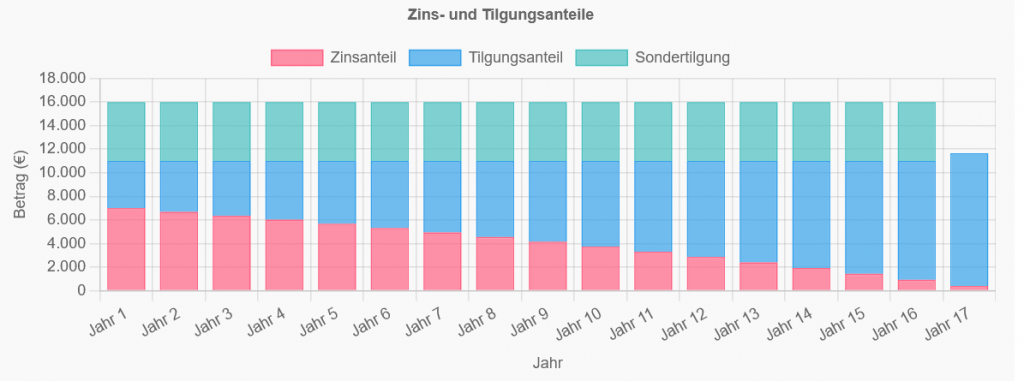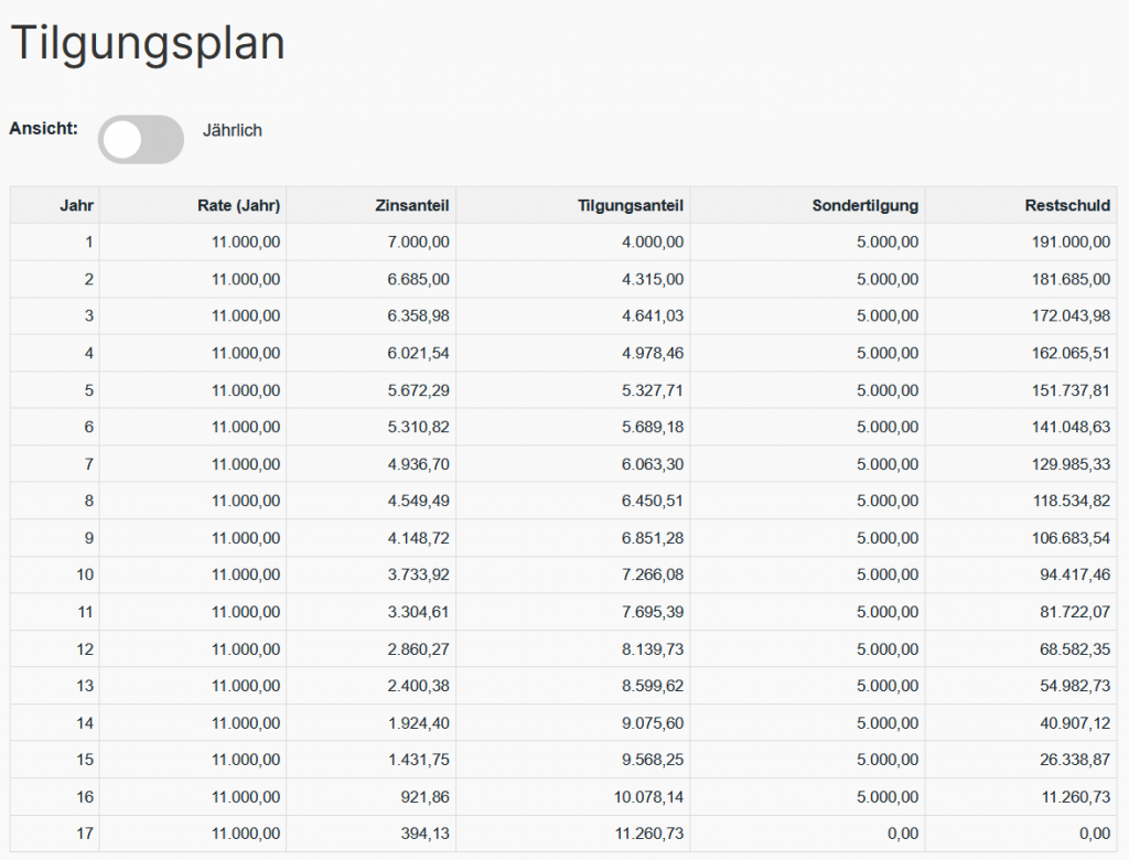 Darlehensbetrag: 200.000 €, Zinssatz: 3,5 %, Anfänglicher Tilgungssatz: 2,0 %, Jährliche, Sondertilgung: 5.000 €, Zinsbindungsdauer: 10